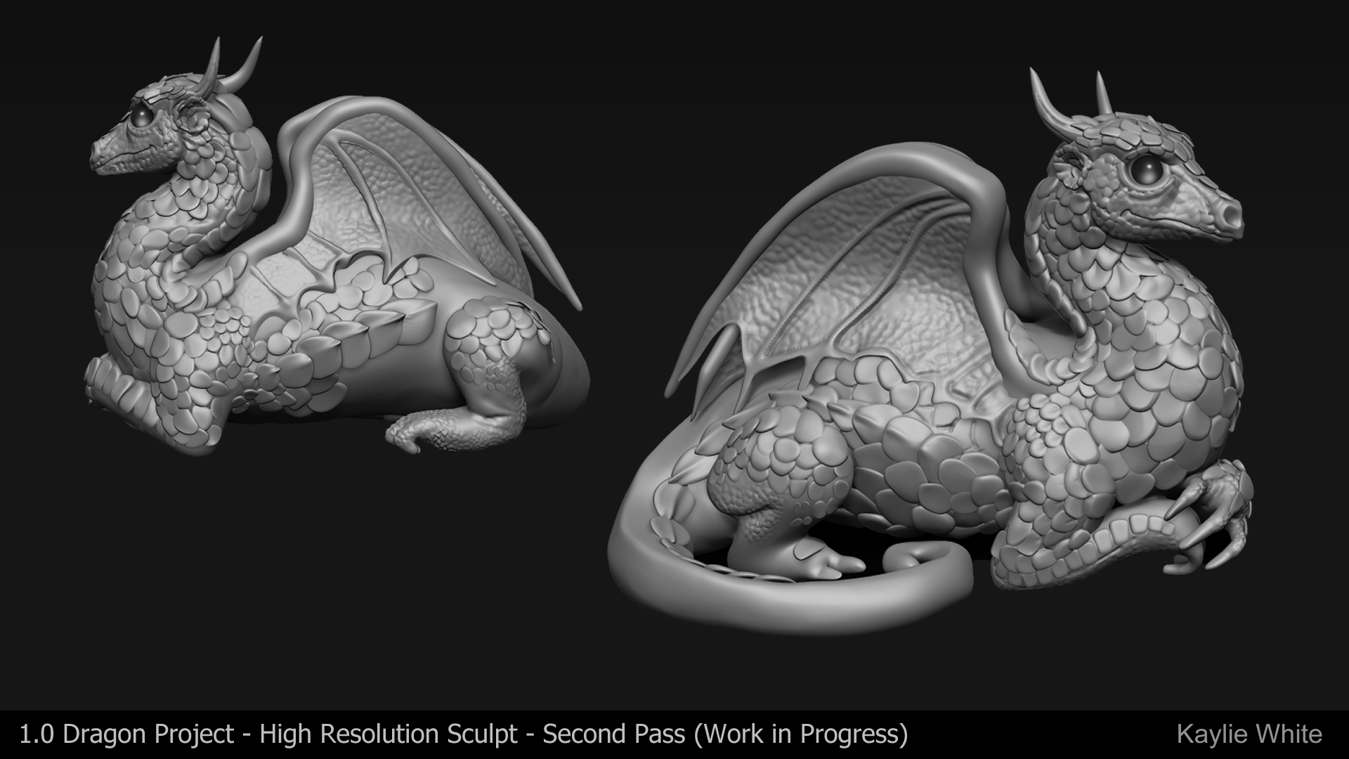 Here is the current progress of my dragon sculpt! Unfortunately, I wasn't able to finish all of it this week - I've never attempted a sculpt of this detail level before and it's been taking a lot more time than I anticipated! For the scales, I created a series of varying shapes and used the insert mesh brush to place each one and then manipulated them into place - I'm not sure that this was the best way to go about this, but I have at least saved each chunk of scales into separate tools so I can easily remove or modify them, down to individual scales.